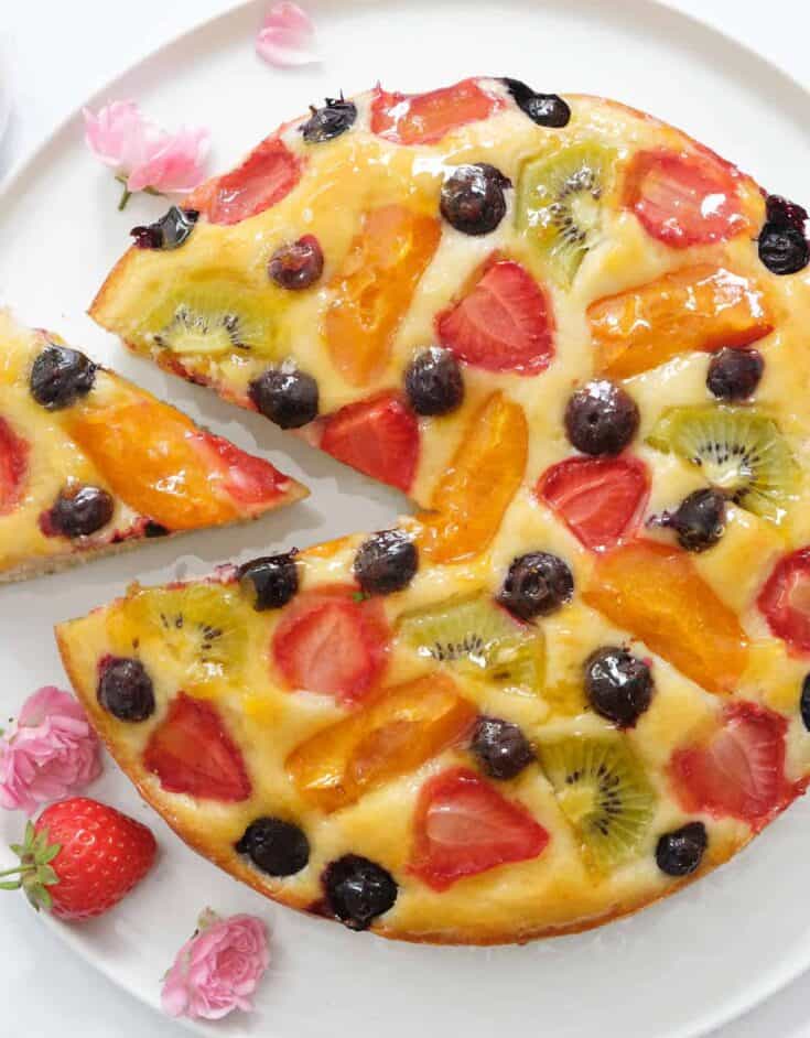 This gorgeous fruit cake is made with plenty of yogurt and fresh fruit. It's so moist and fruity, perfect for any occasion.